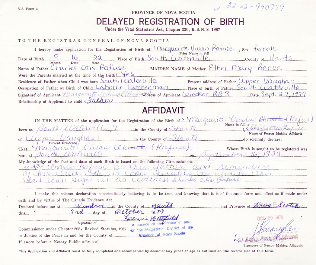I hereby make application for the Registration of Birth of Marguerite VivianRafuse Sex Female