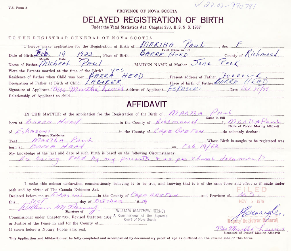 IN THE MATTER of the application for the Registration of the Birth of MarthaPaul