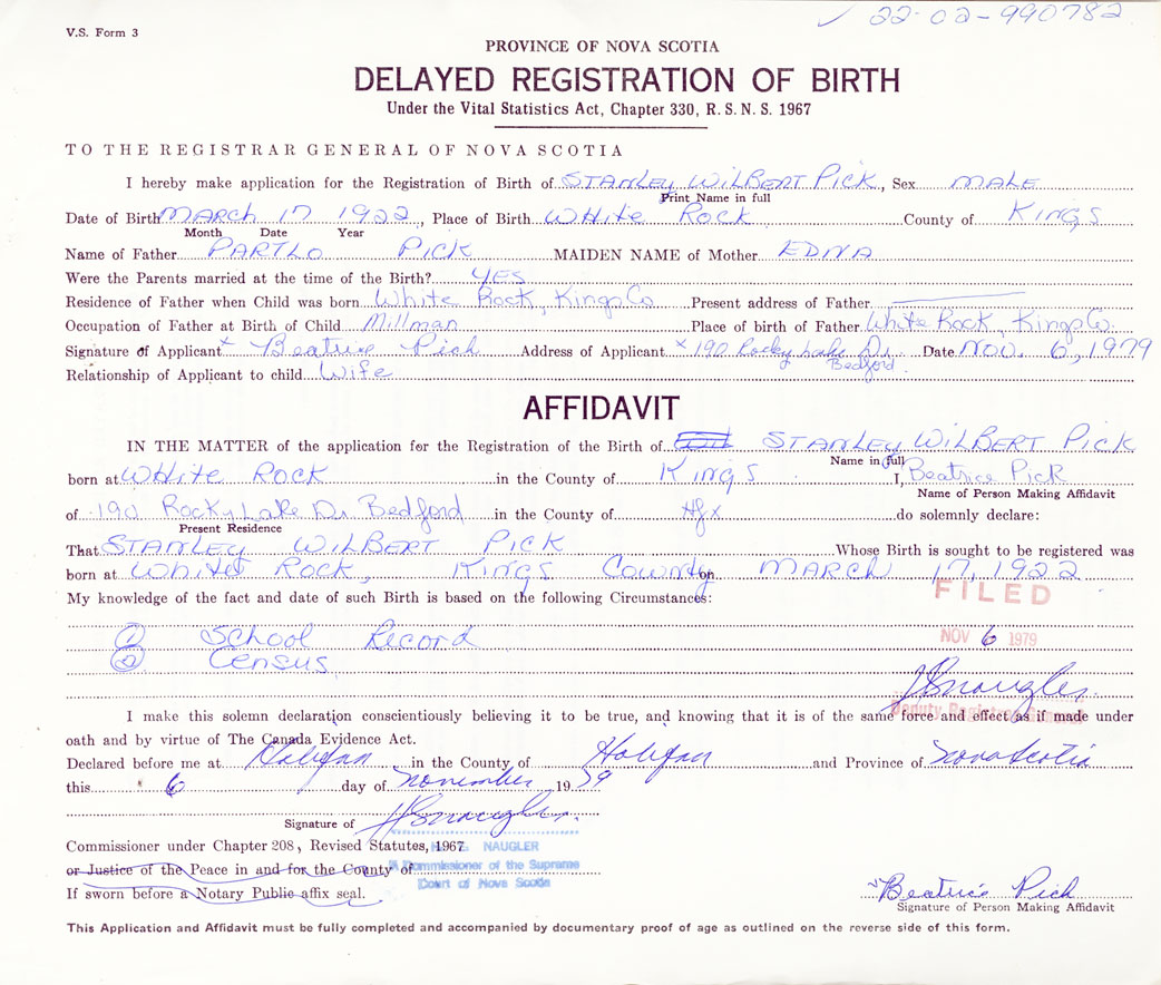 IN THE MATTER of the application for the Registration of the Birth of Stanley WilbertPick