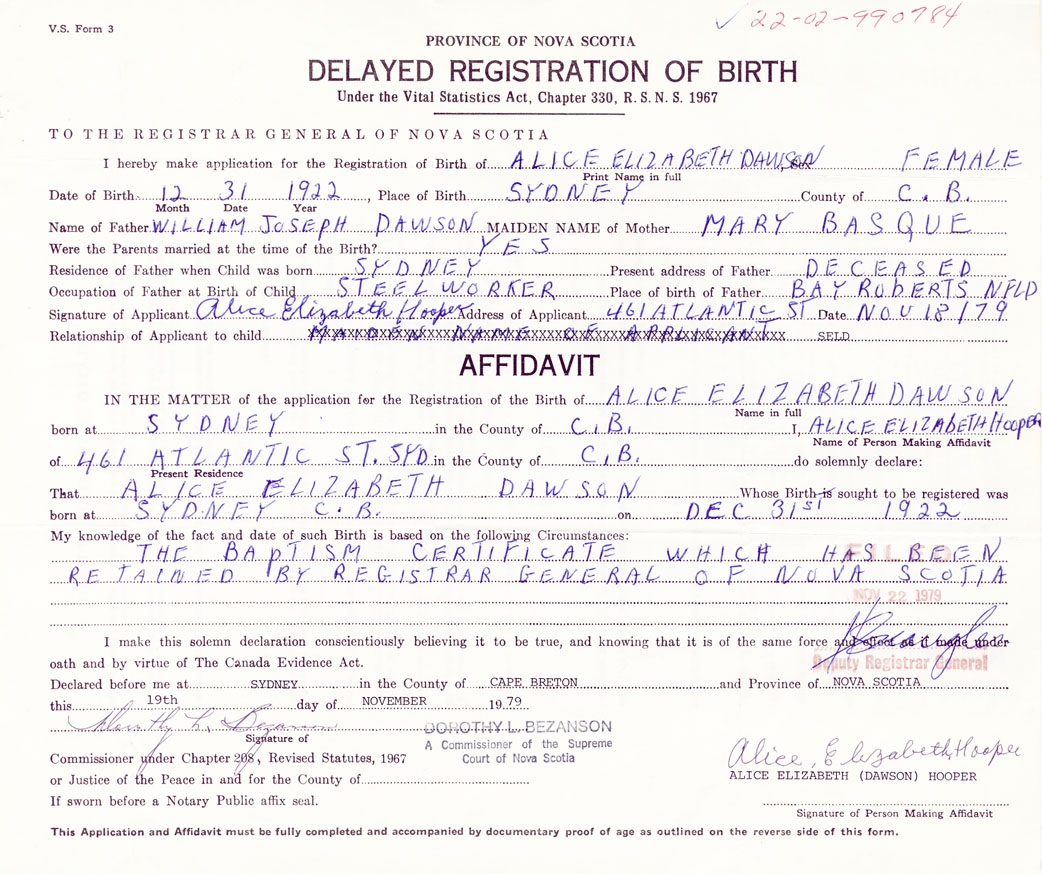 Signature of Applicant Alice Elizabeth Hooper Address of Applicant 461 Atlantic Street, Sydney, Cape Breton Date 18 November 1979