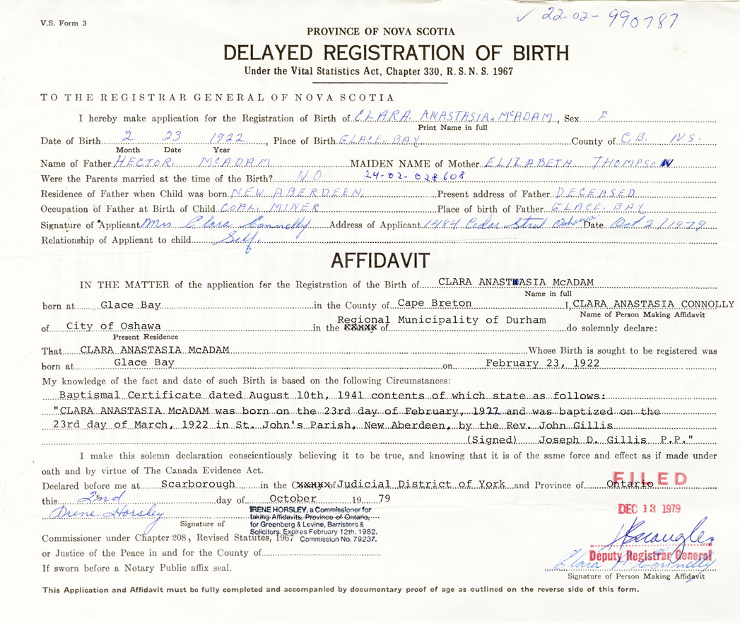 Baptismal certificate dated August 10th, 1941 contents of which state as follows: "Clara Anastasia McAdam was born on the 23rd day of February 1922 and was baptized on the 23rd day of March, 1922 in St. johns Parish, New Aberdeen, by the Rev. John Gillis". (signed Joseph D. Gillis, P.P.)