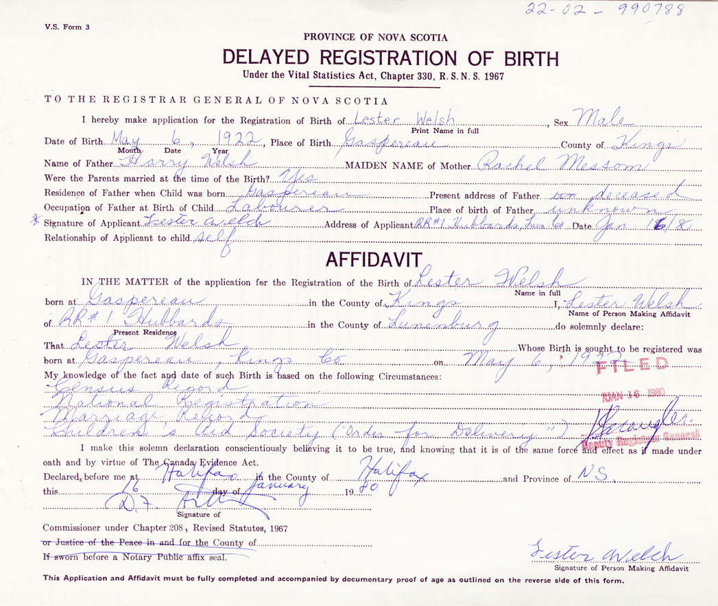 Signature of Applicant Lester Welch Address of Applicant RR #1, Hubbards, Lunenburg Date 16 January 1980