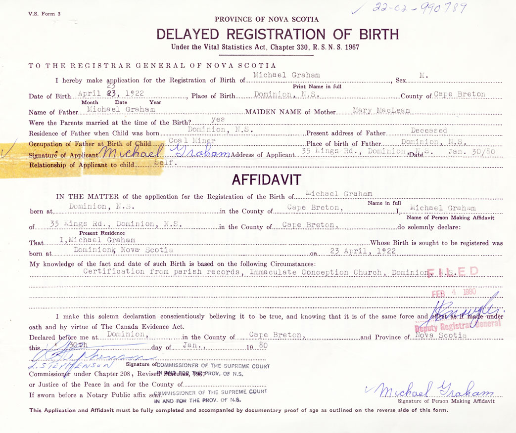 Signature of Applicant Michael Graham Address of Applicant 35 Kings Road, Dominion, Cape Breton Date 30 January 1980