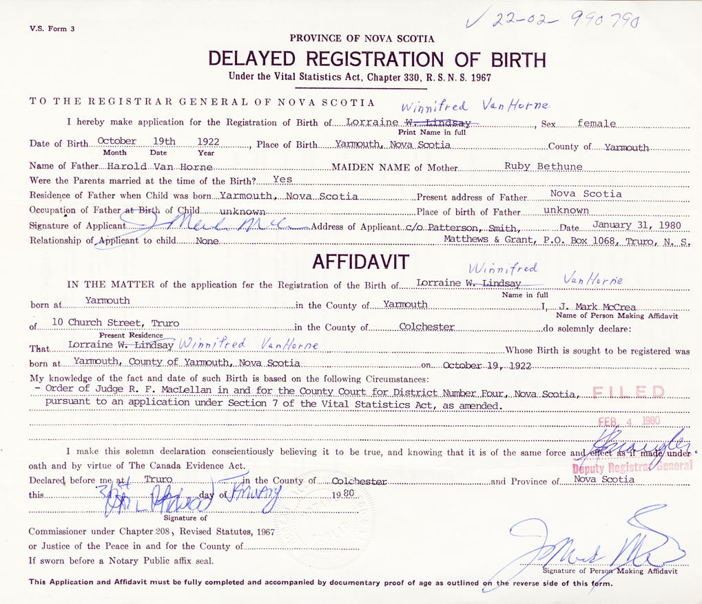 IN THE MATTER of the application for the Registration of the Birth of WinnifredVanHorne