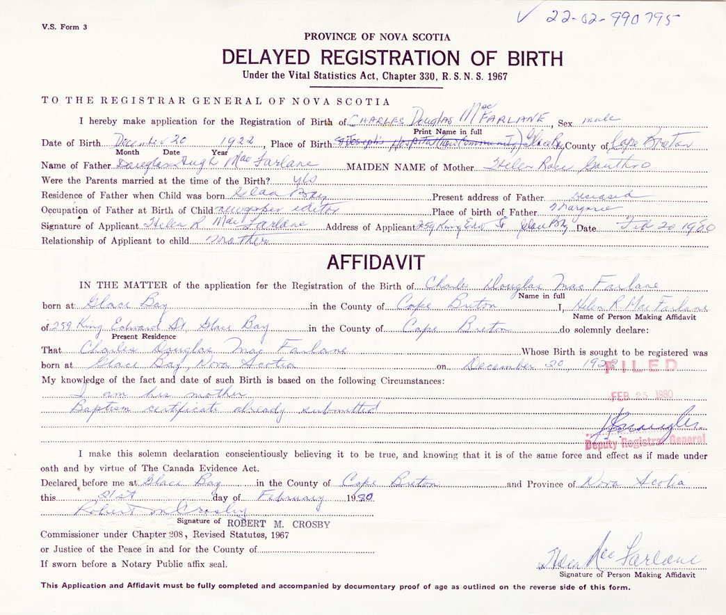 Date of Birth December 20, 1922 Place of Birth Glace BayCounty of Cape Breton