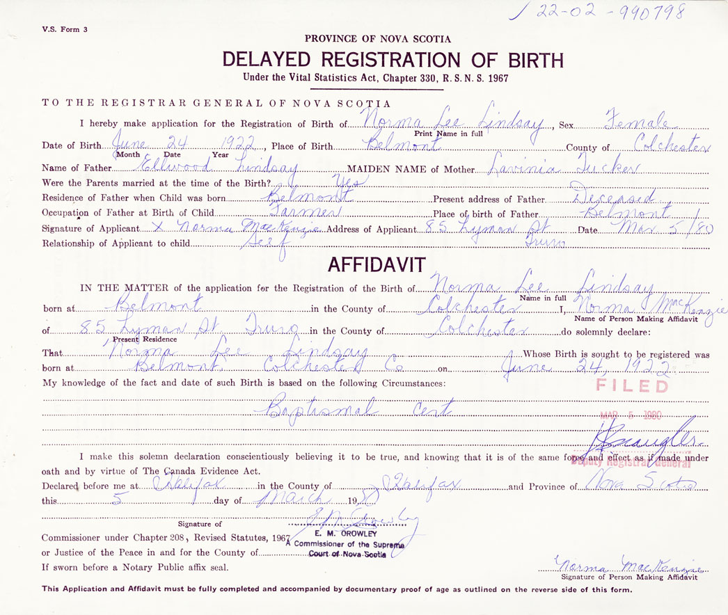 I hereby make application for the Registration of Birth of Norma LeeLindsay Sex Female