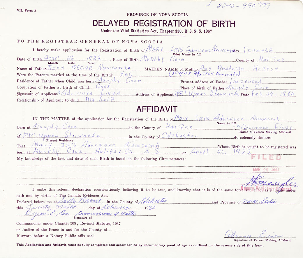 Date of Birth April 26, 1922 Place of Birth Murphy CoveCounty of Halifax