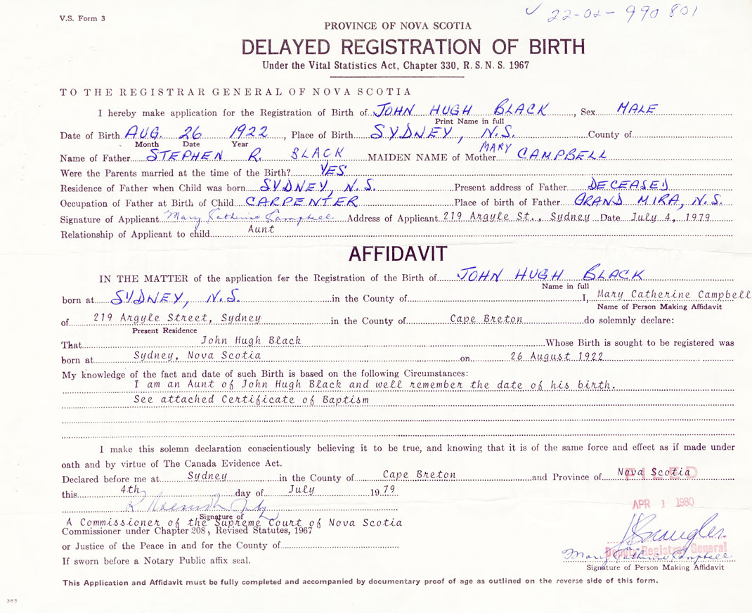 Date of Birth August 26, 1922 Place of Birth SydneyCounty of Cape Breton