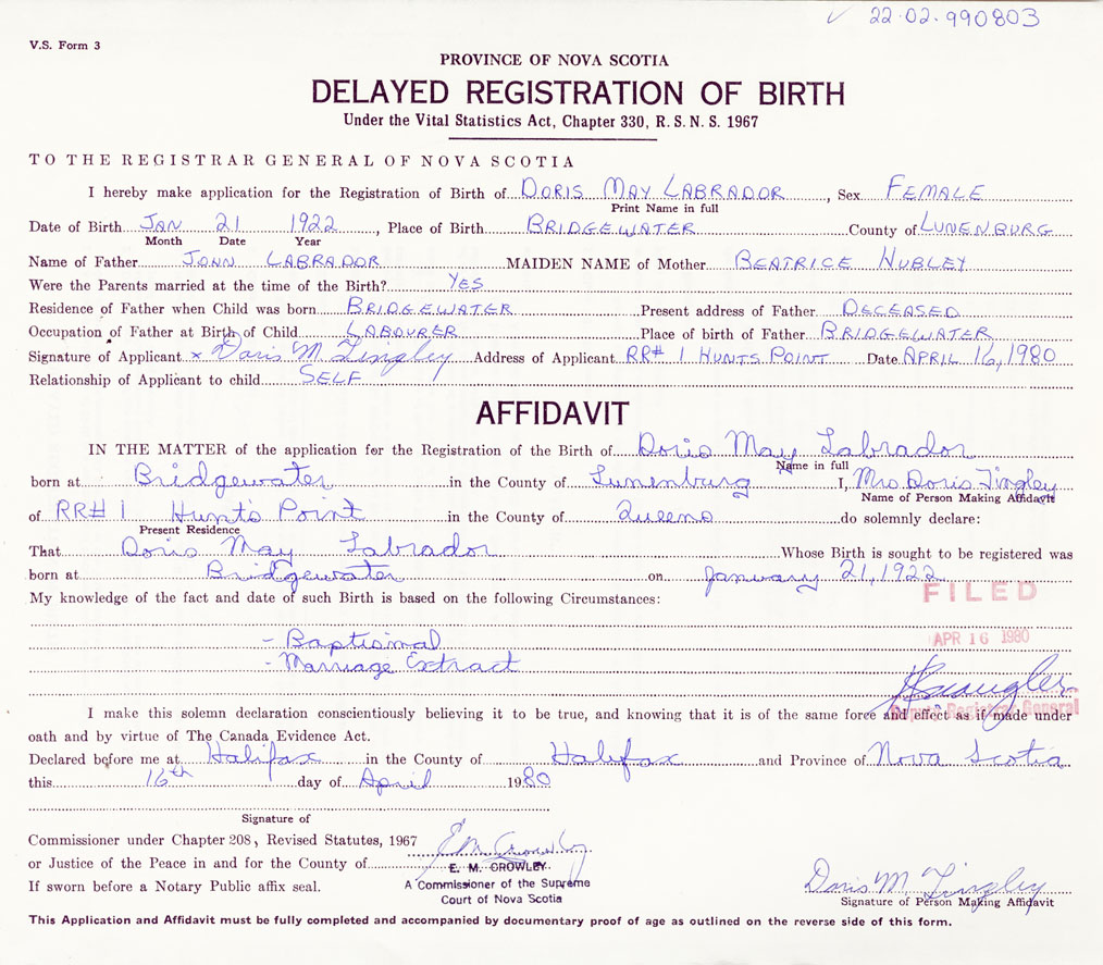 IN THE MATTER of the application for the Registration of the Birth of Doris MayLabrador