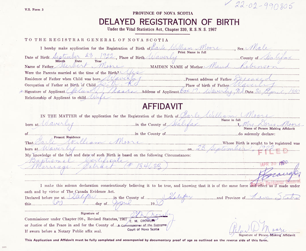 Signature of Applicant Aileen D. Moore Address of Applicant Box 17, Waverley, Halifax Date 30 April 1980