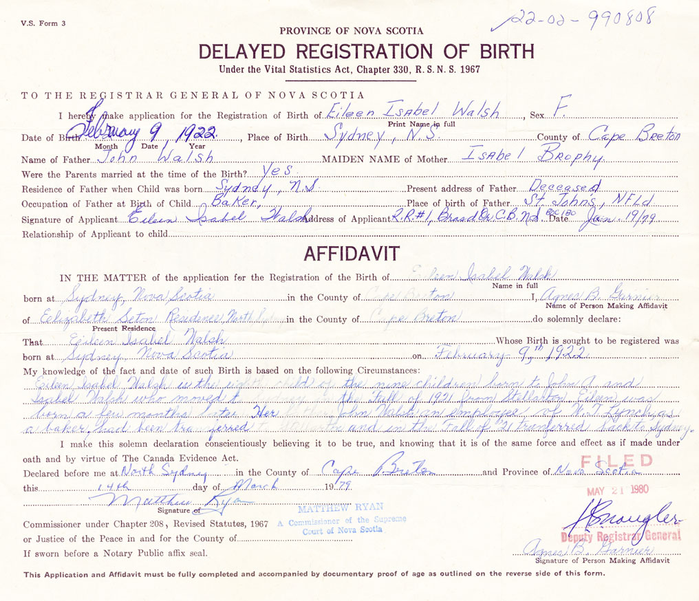 Eileen Isabel Walsh is the eighth child of the nine children born to John A. and Isabel Walsh who moved to Sydney in the fall of 1921 from Stellarton. Eileen was born a few months later. Her father John Walsh, an employee of W. T. Lynch, as a baker, had been transferred to Stellarton and in the fall of 1921 was transferred back to Sydney.