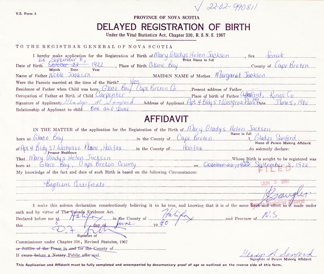 Signature of Applicant gladys M. Sanford Address of Applicant Apt. 4, Building 57, Westgrove Place, Halifax Date 5 June 1980