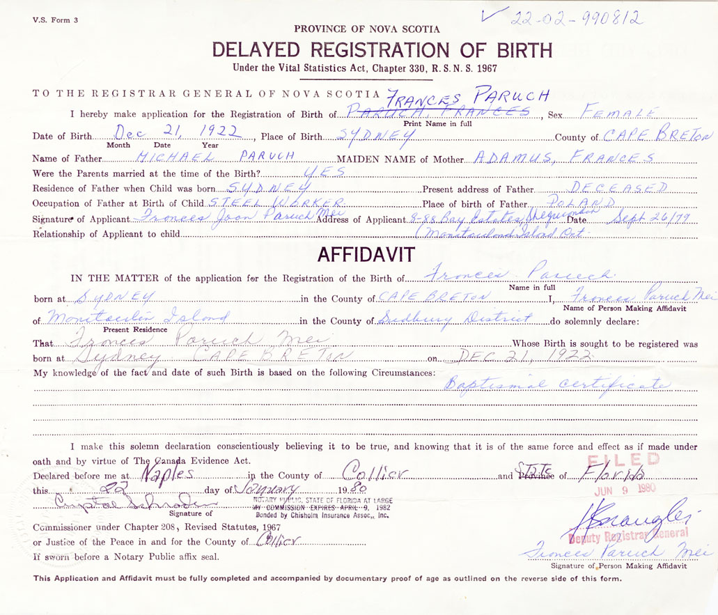 I hereby make application for the Registration of Birth of FrancesParuch Sex Female