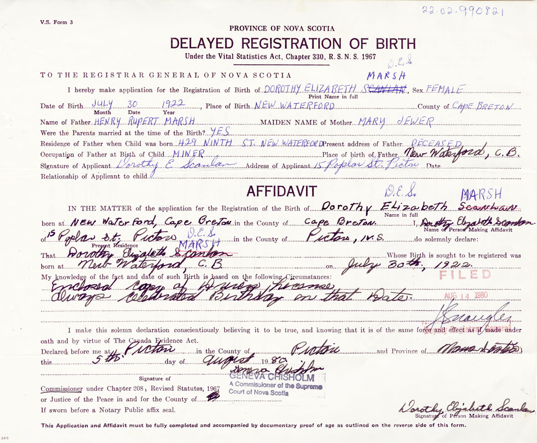 Date of Birth July 30, 1922 Place of Birth New WaterfordCounty of Cape Breton