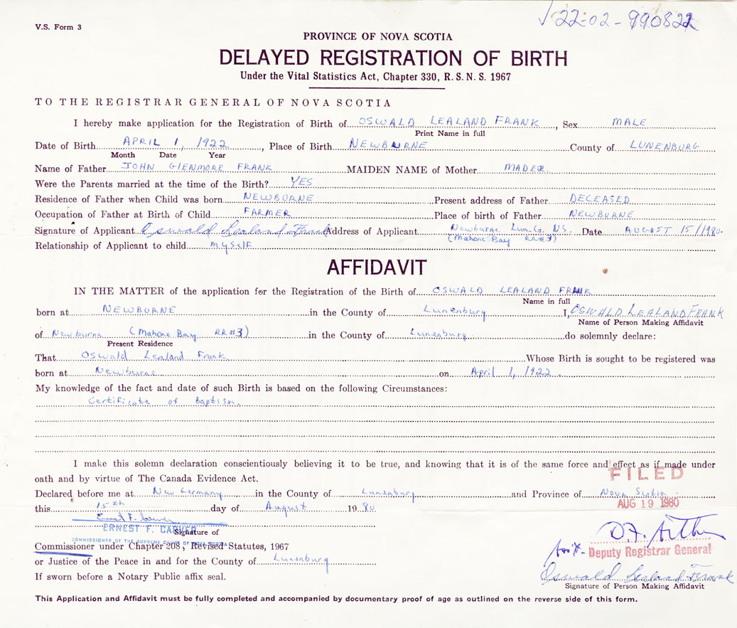 I hereby make application for the Registration of Birth of Oswald LealandFrank Sex Male