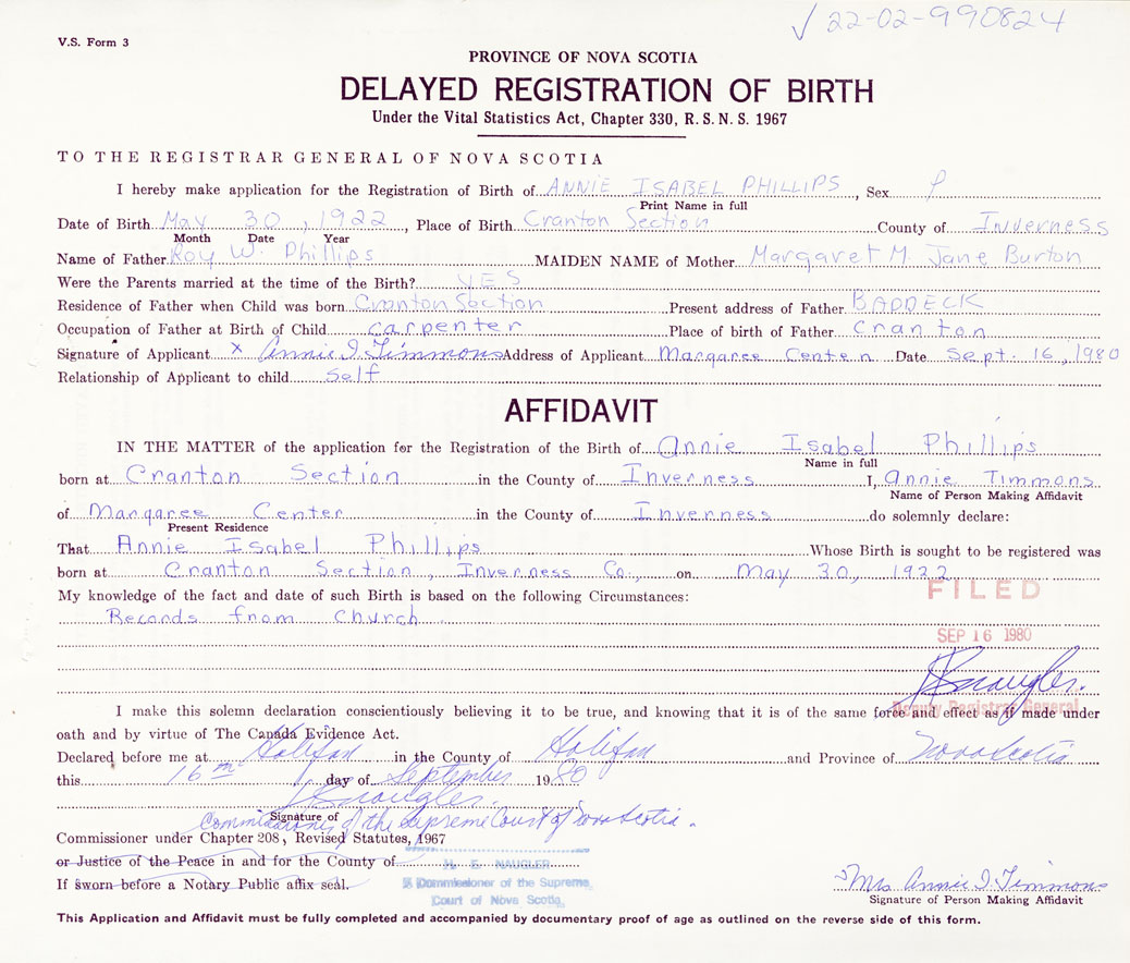 Signature of Applicant Annie I. Timmons Address of Applicant Margaree Center, Inverness Date 16 September 1980