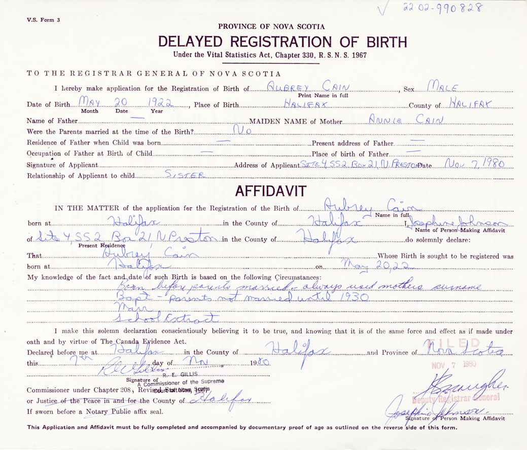 I hereby make application for the Registration of Birth of AubreyCain Sex Male
