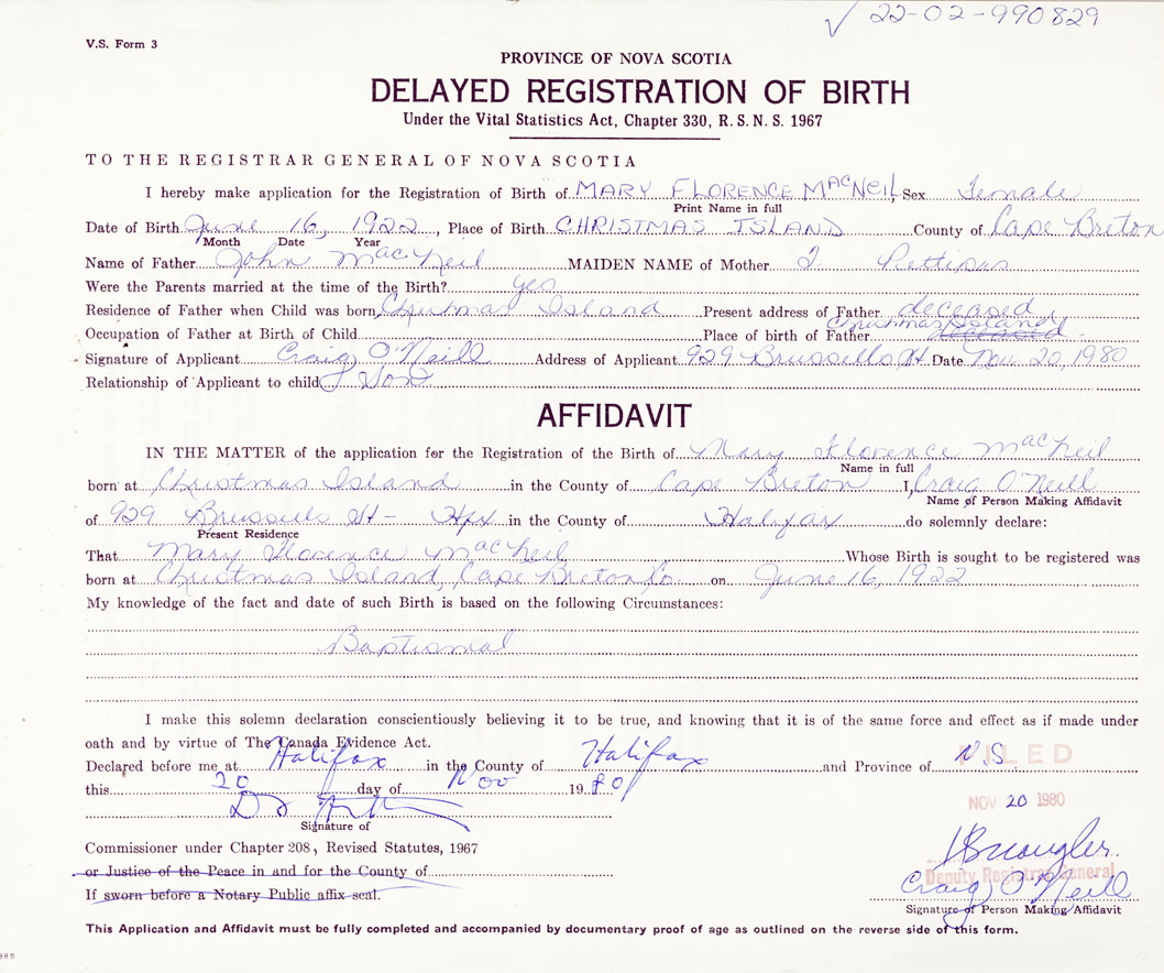 Date of Birth June 16, 1922 Place of Birth Christmas IslandsCounty of Cape Breton