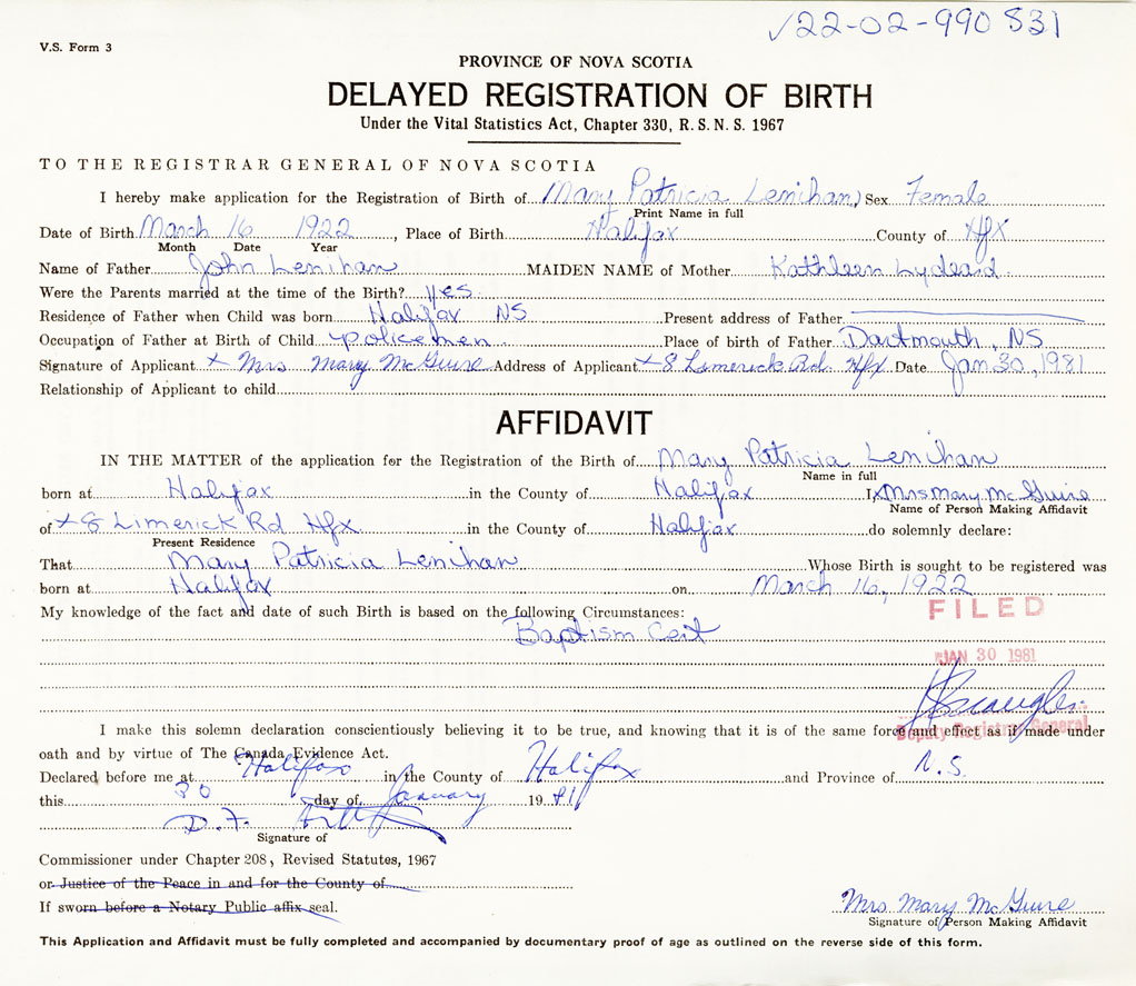 I hereby make application for the Registration of Birth of Mary PatriciaLenihan Sex Female