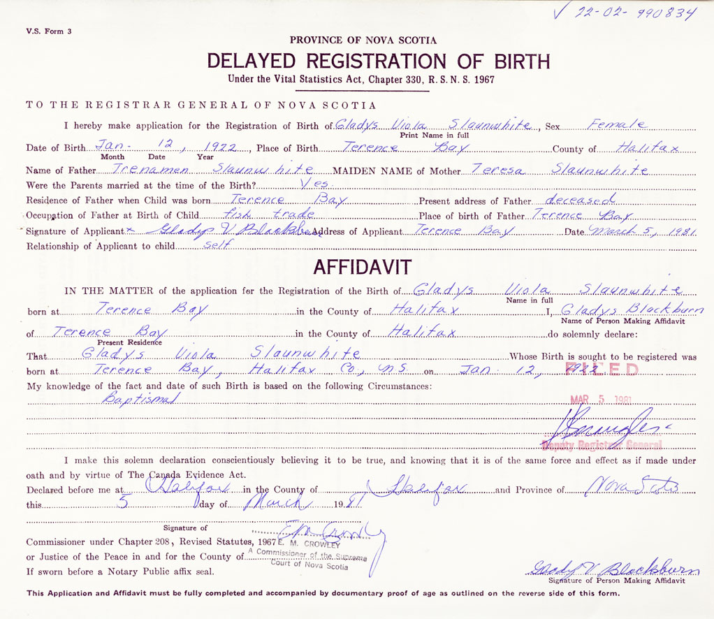 Signature of Applicant Gladys V. Blackburn Address of Applicant Terence Bay, Halifax Date 5 March 1981