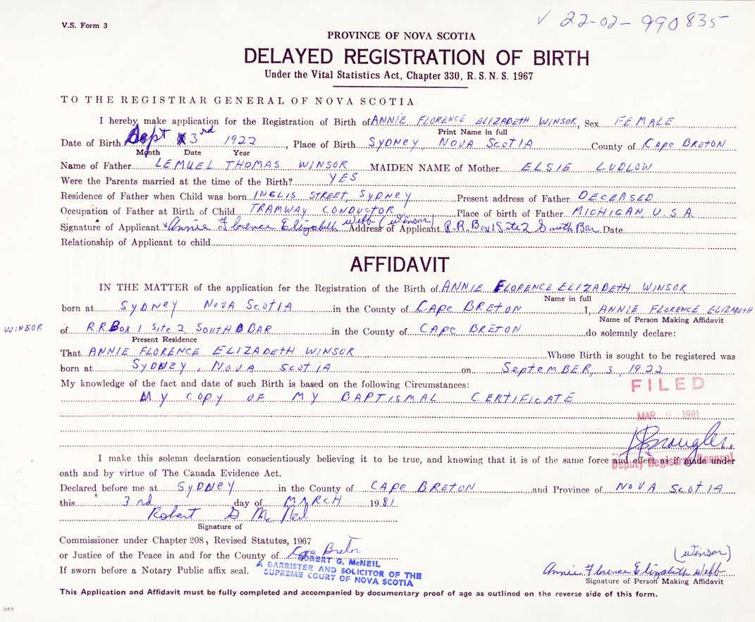 Signature of Applicant Annie Florence Elizabeth Webb (Winsor) Address of Applicant RR Box 1, Site 2, South Bar, Cape Breton Date March 1981