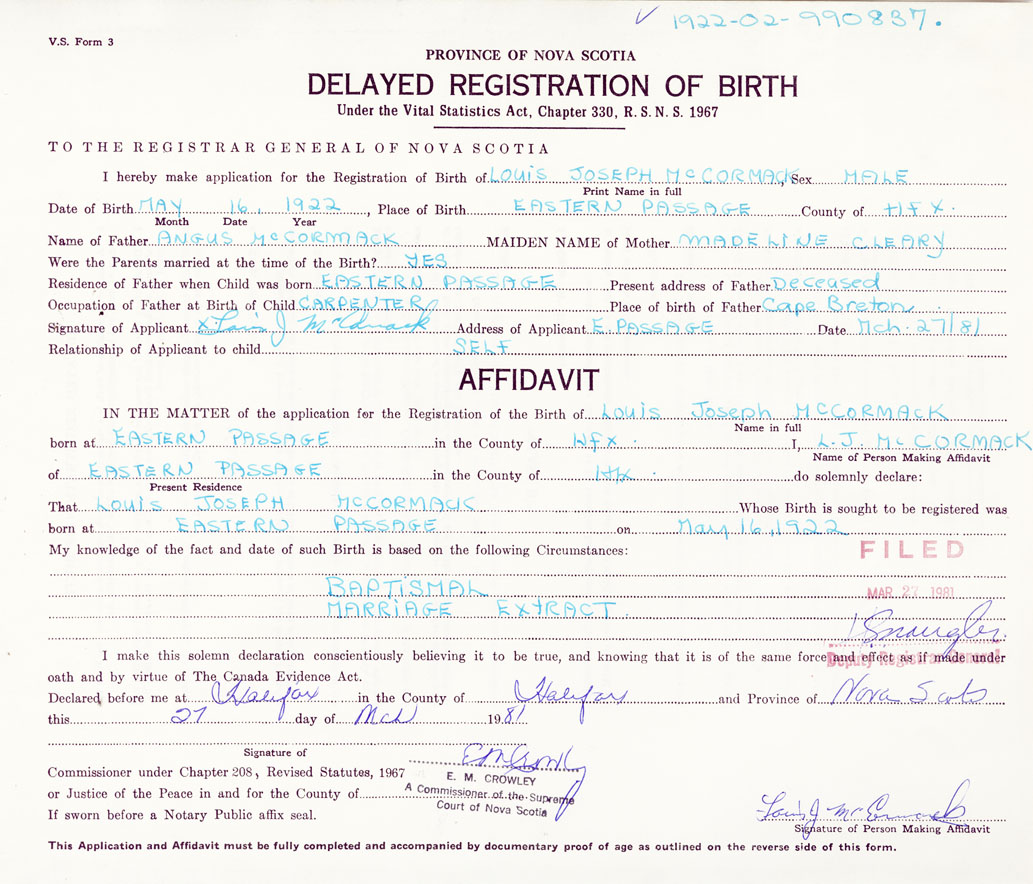 Date of Birth May 16, 1922 Place of Birth Eastern PassageCounty of Halifax