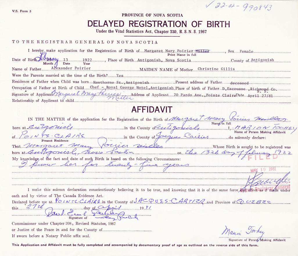 I hereby make application for the Registration of Birth of Margaret MaryPoirier Sex Female