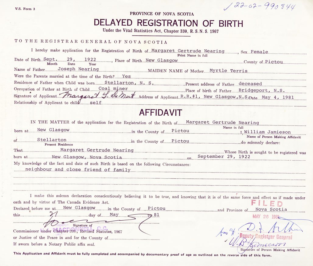 Signature of Applicant Margaret G. DeMont Address of Applicant RR #1, New Glasgow, Pictou Date 4 May 1981