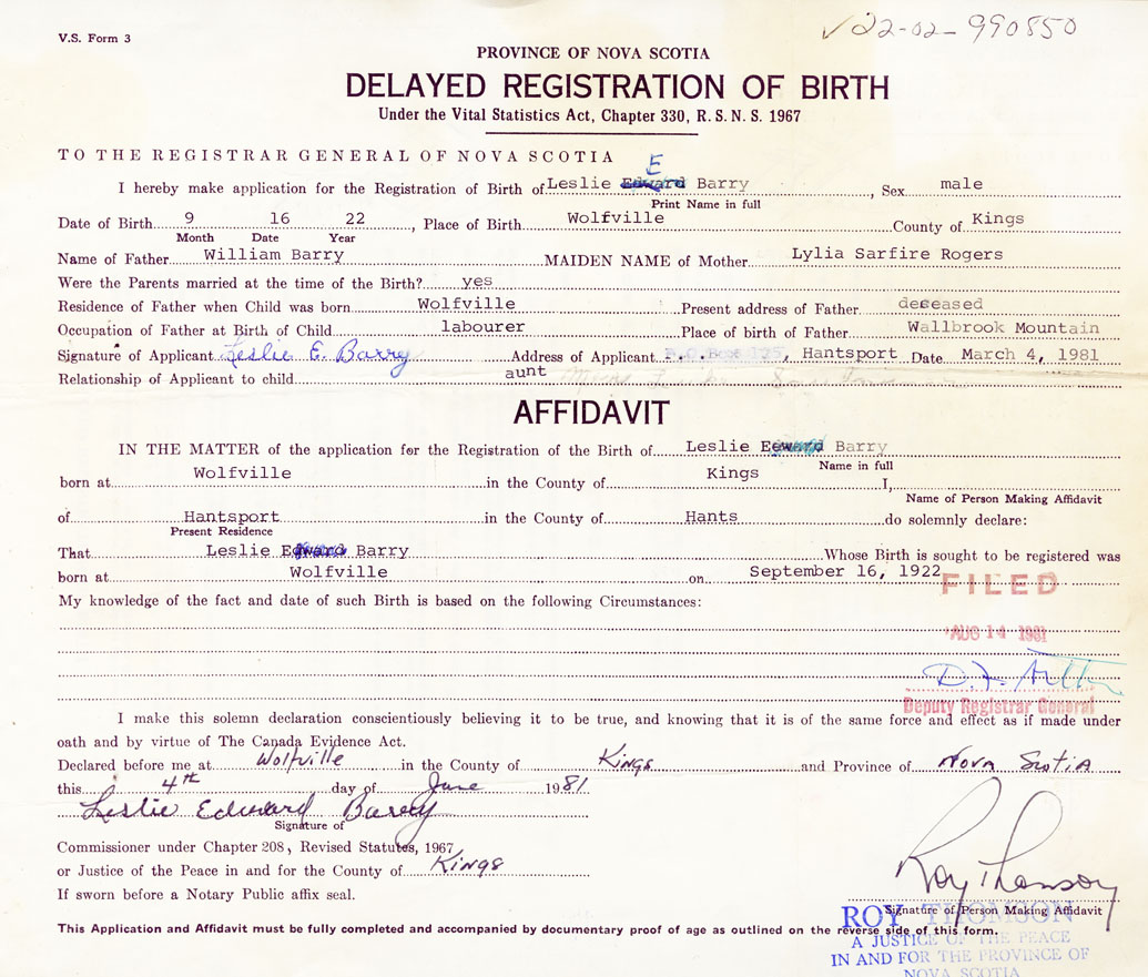 Date of Birth September 16, 1922 Place of Birth WolfvilleCounty of Kings