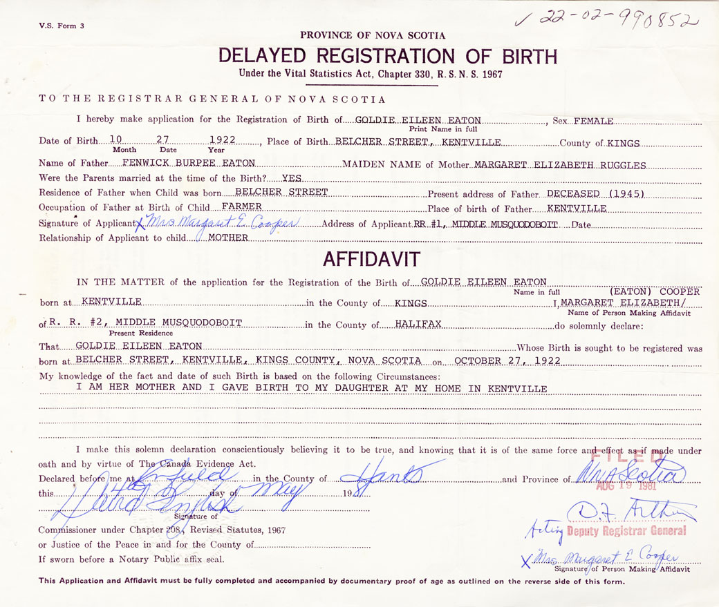 I hereby make application for the Registration of Birth of Goldie EileenEaton Sex Female