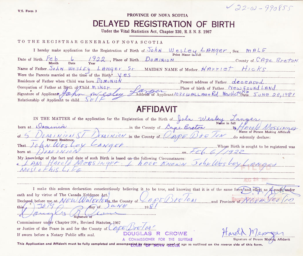 Signature of Applicant John Wesley Langer Address of Applicant 1033 Wallace Road, New Victoria, Cape Breton Date 23 June 1981
