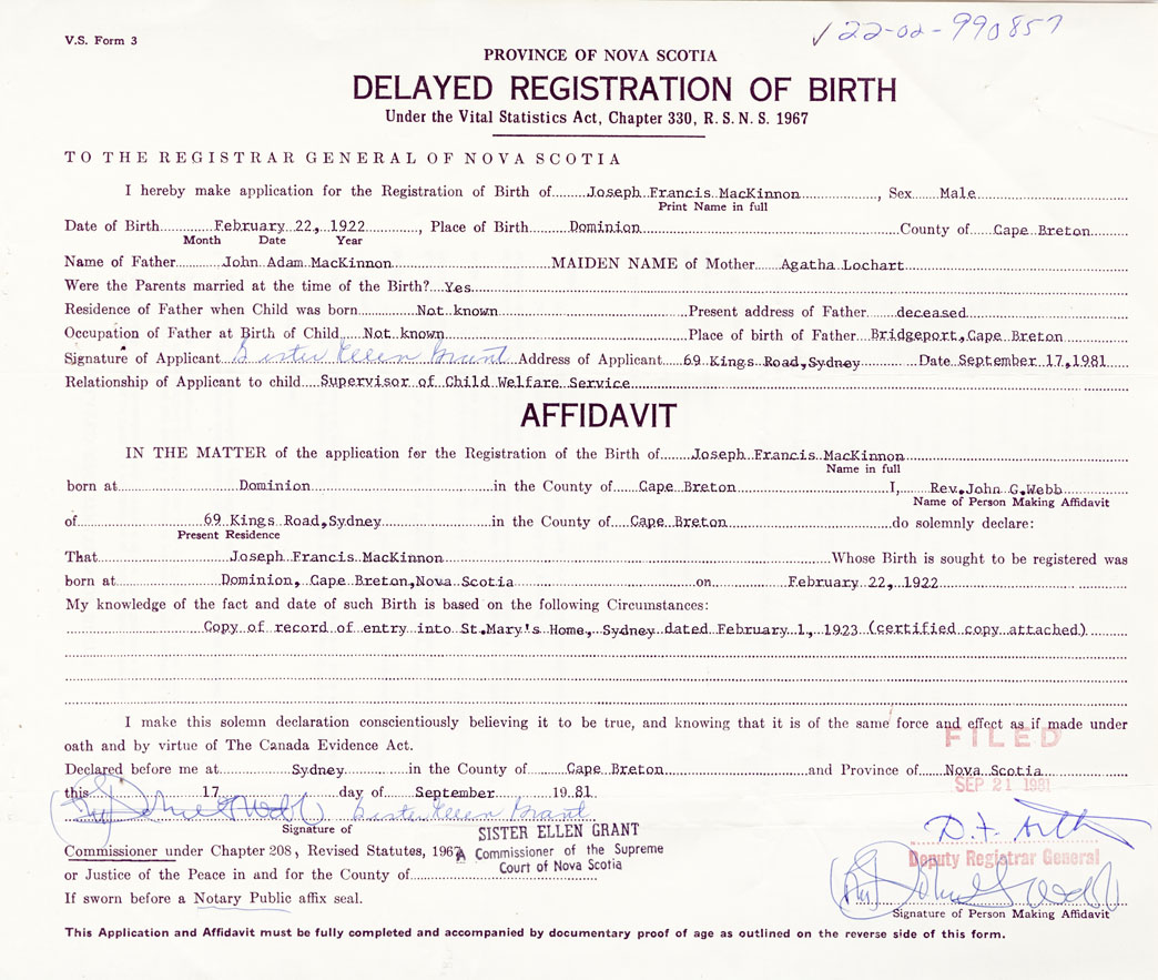 Date of Birth February 22, 1922 Place of Birth DominionCounty of Cape Breton