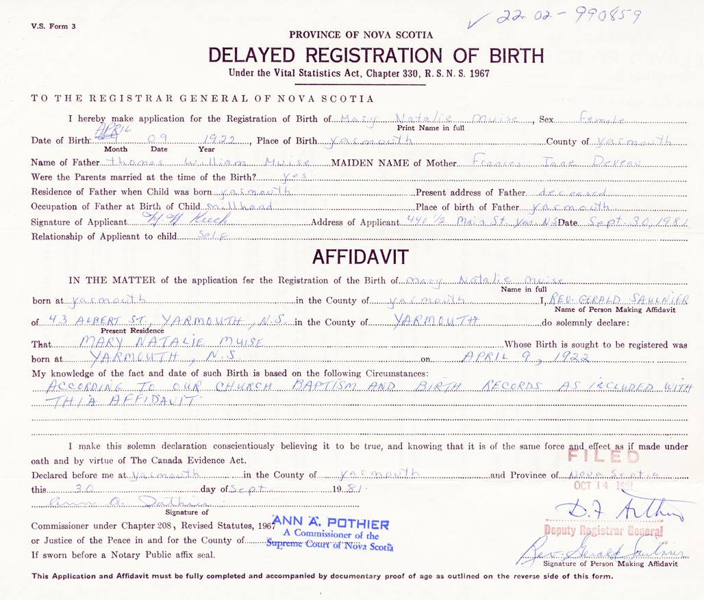 Name of Father thomas William Muise MAIDEN NAME of Mother Frances Jane Deveau