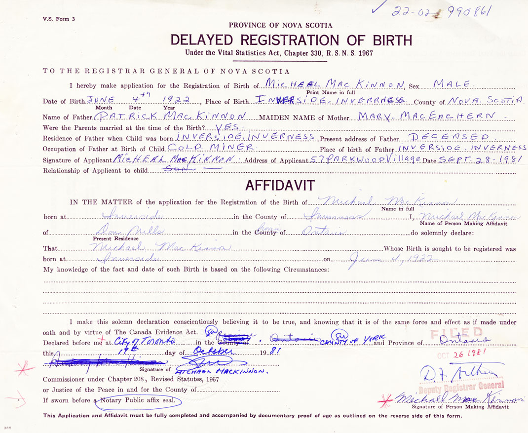 I hereby make application for the Registration of Birth of MichaelMacKinnon Sex Male