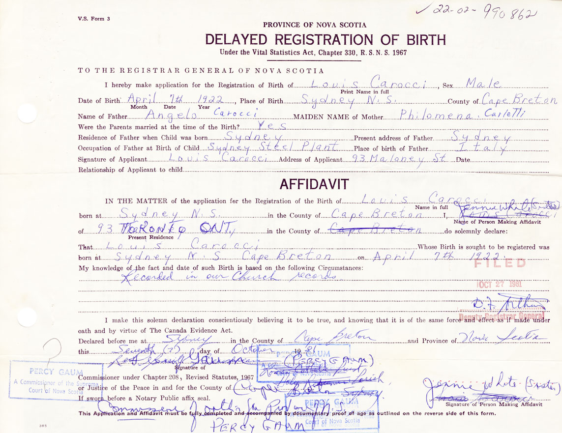 I hereby make application for the Registration of Birth of LouisCarocci Sex Male