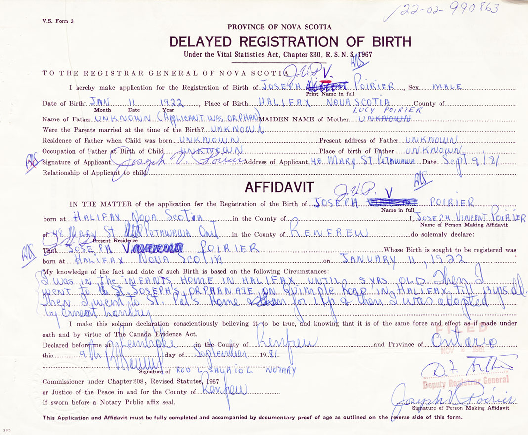 IN THE MATTER of the application for the Registration of the Birth of Joseph V.Poirier