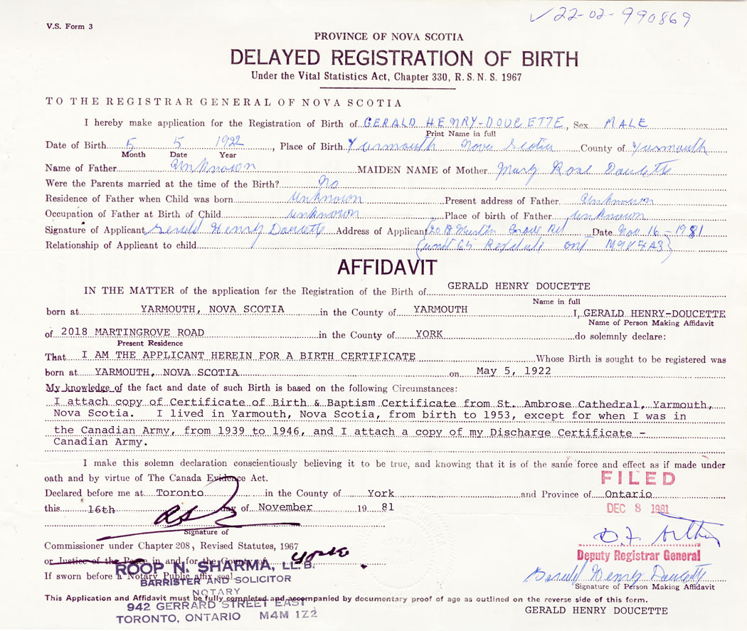 I attach copy of certificate of birth and baptism certificate from St. Ambrose Cathedral, Yarmouth. I lived in Yarmouth from birth to 1953, except for when I was in the Canadian Army from 1939 to 1946 and I attach a copy of my discharge certificate - Canadian Army.