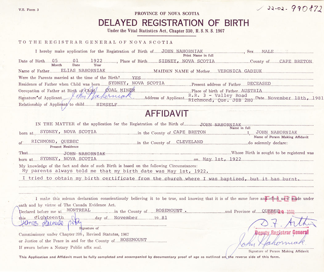 I hereby make application for the Registration of Birth of JohnNahorniak Sex Male