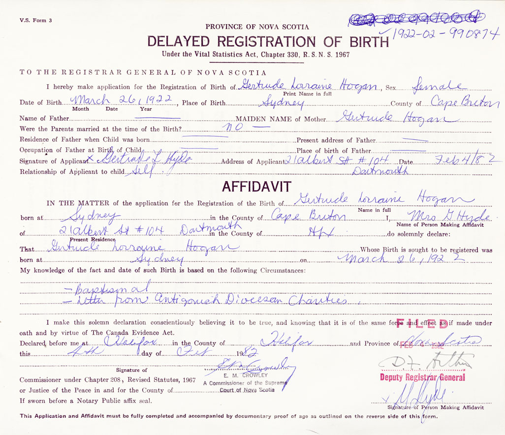 I hereby make application for the Registration of Birth of Gertrude LoraineHogan Sex Female