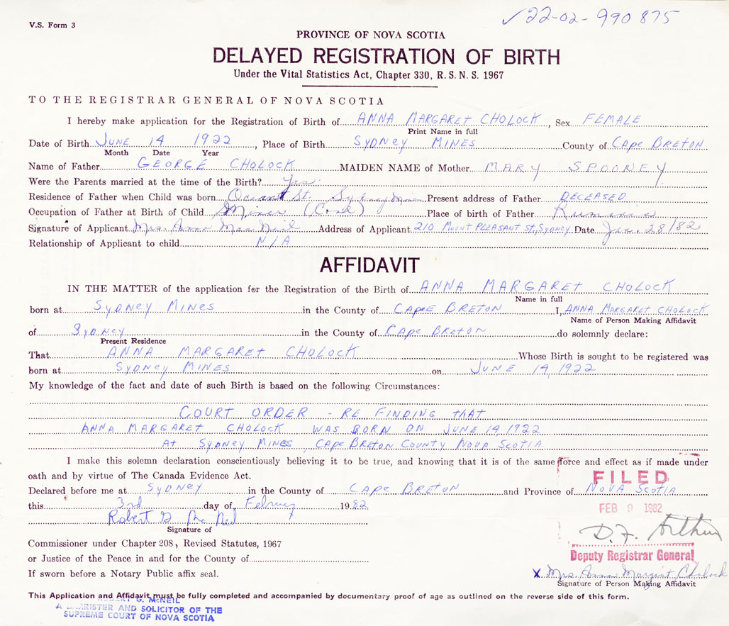 Court Order re: finding that Anna Margaret Cholock was born on June 14, 1922 at Sydney Mines, Cape Breton