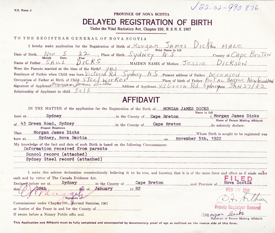 Signature of Applicant Morgan James Dicks Address of Applicant 43 Green Road, Sydney, Cape Breton Date 27 January 1982