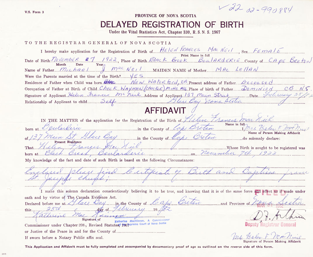 Signature of Applicant Helen Frances McNeil Address of Applicant 137 Main Street, Glace Bay, Cape Breton Date 25 February 1982