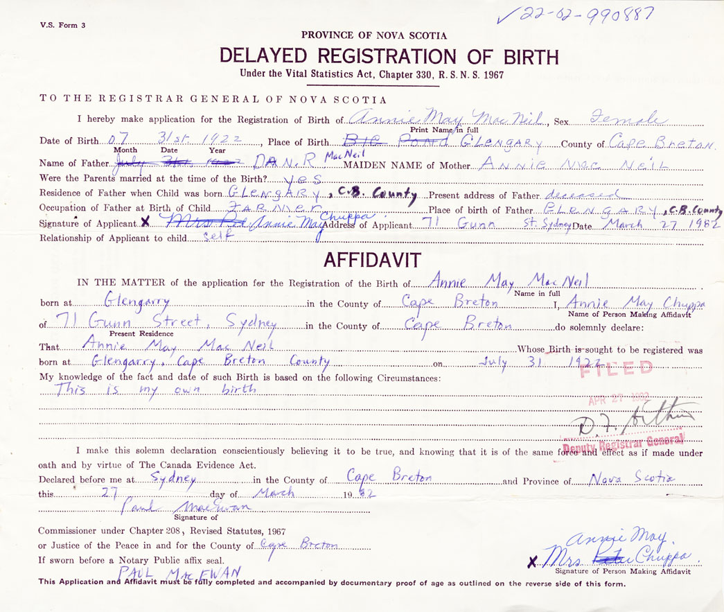 IN THE MATTER of the application for the Registration of the Birth of Annie MayMacNeil