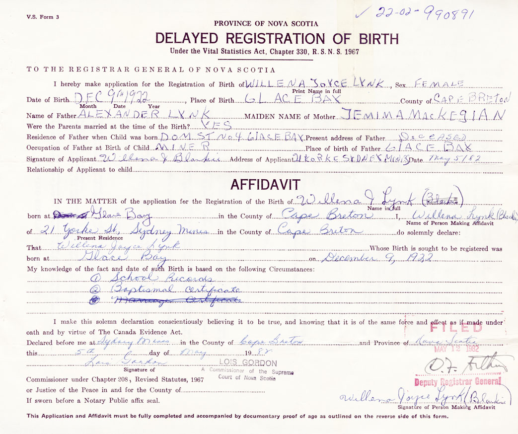 IN THE MATTER of the application for the Registration of the Birth of Willena JoyceLynk
