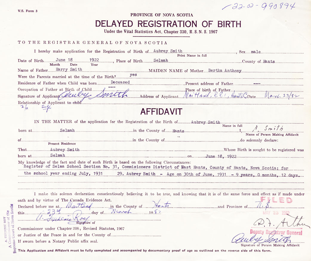 Signature of Applicant Aubrey Smith Address of Applicant RR #1, Maitland, Hants Date 23 March 1982