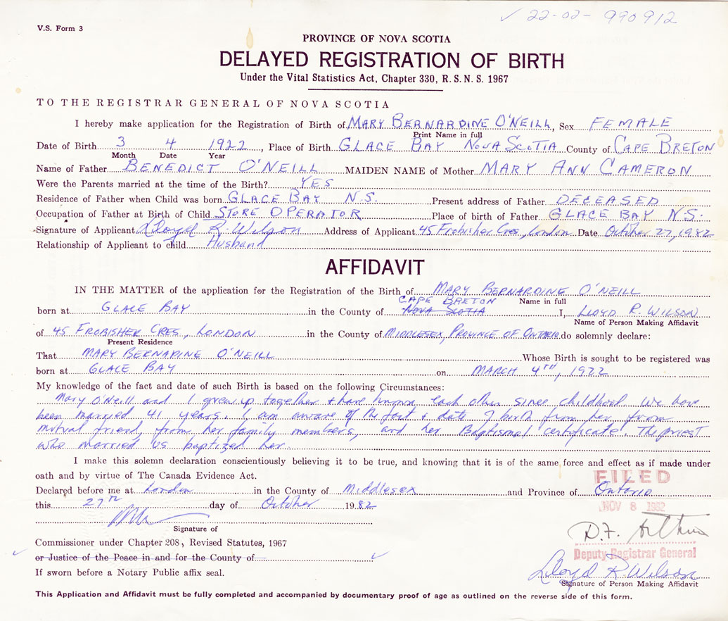 Date of Birth March 4, 1922 Place of Birth Glace BayCounty of Cape Breton