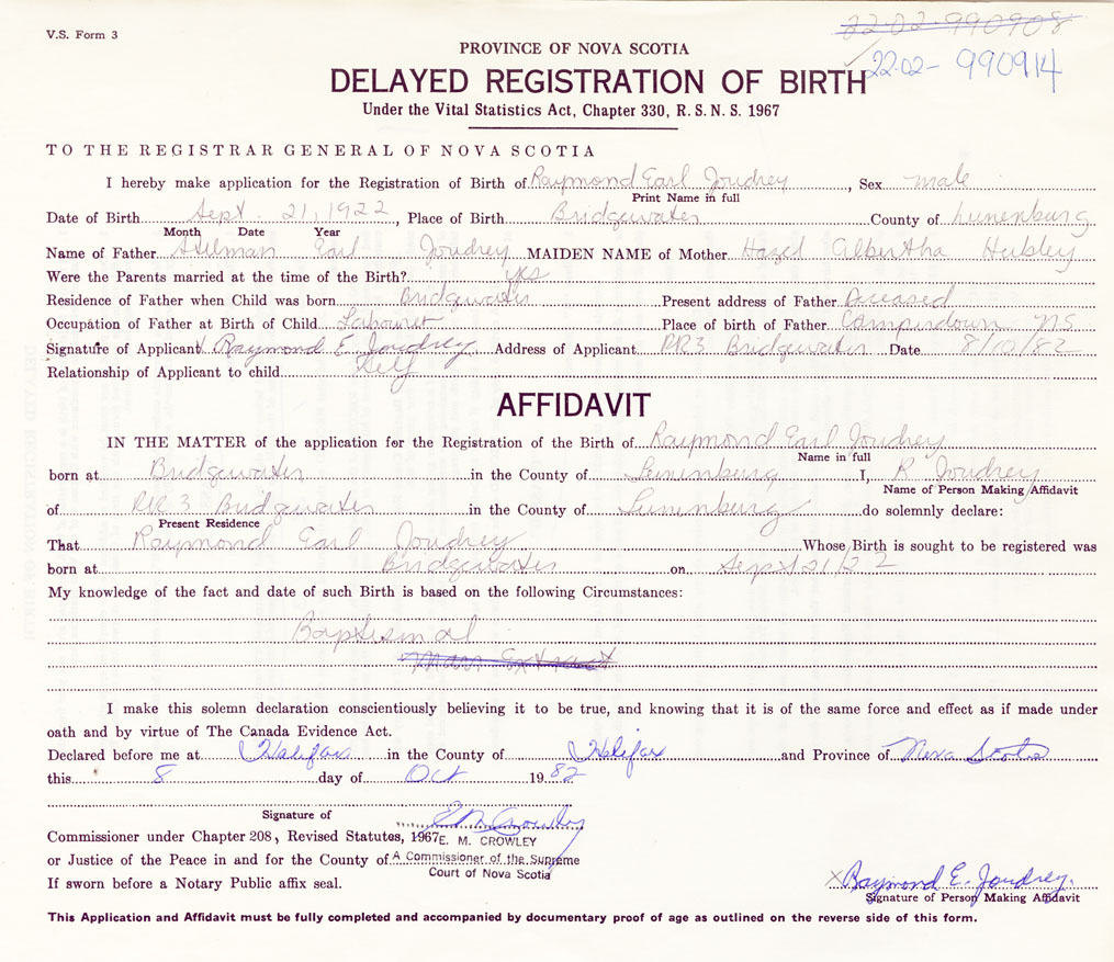I hereby make application for the Registration of Birth of Raymond EarlJoudrey Sex Male