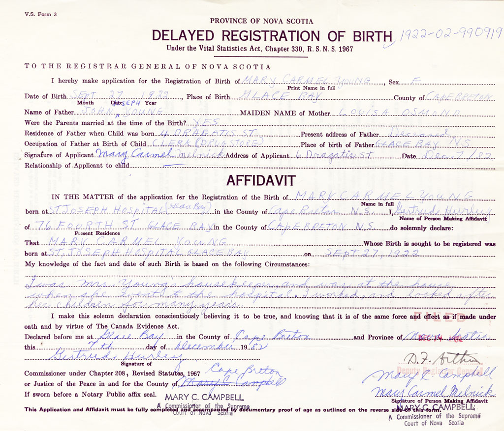 Signature of Applicant Mary Carmel Melnick Address of Applicant 6 Dragatis Street, Glace Bay, Cape Breton Date 7 December 1982