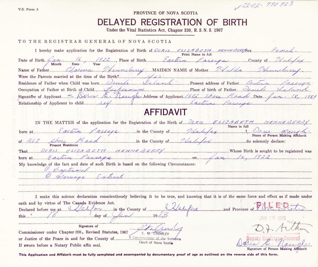 Date of Birth January 16, 1922 Place of Birth Eastern PassageCounty of Halifax