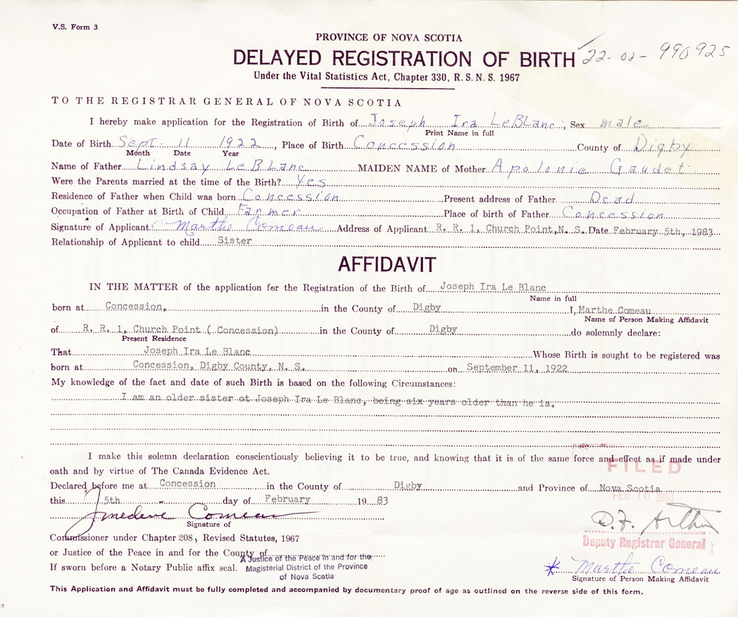 I hereby make application for the Registration of Birth of Joseph IraLeBlanc Sex Male